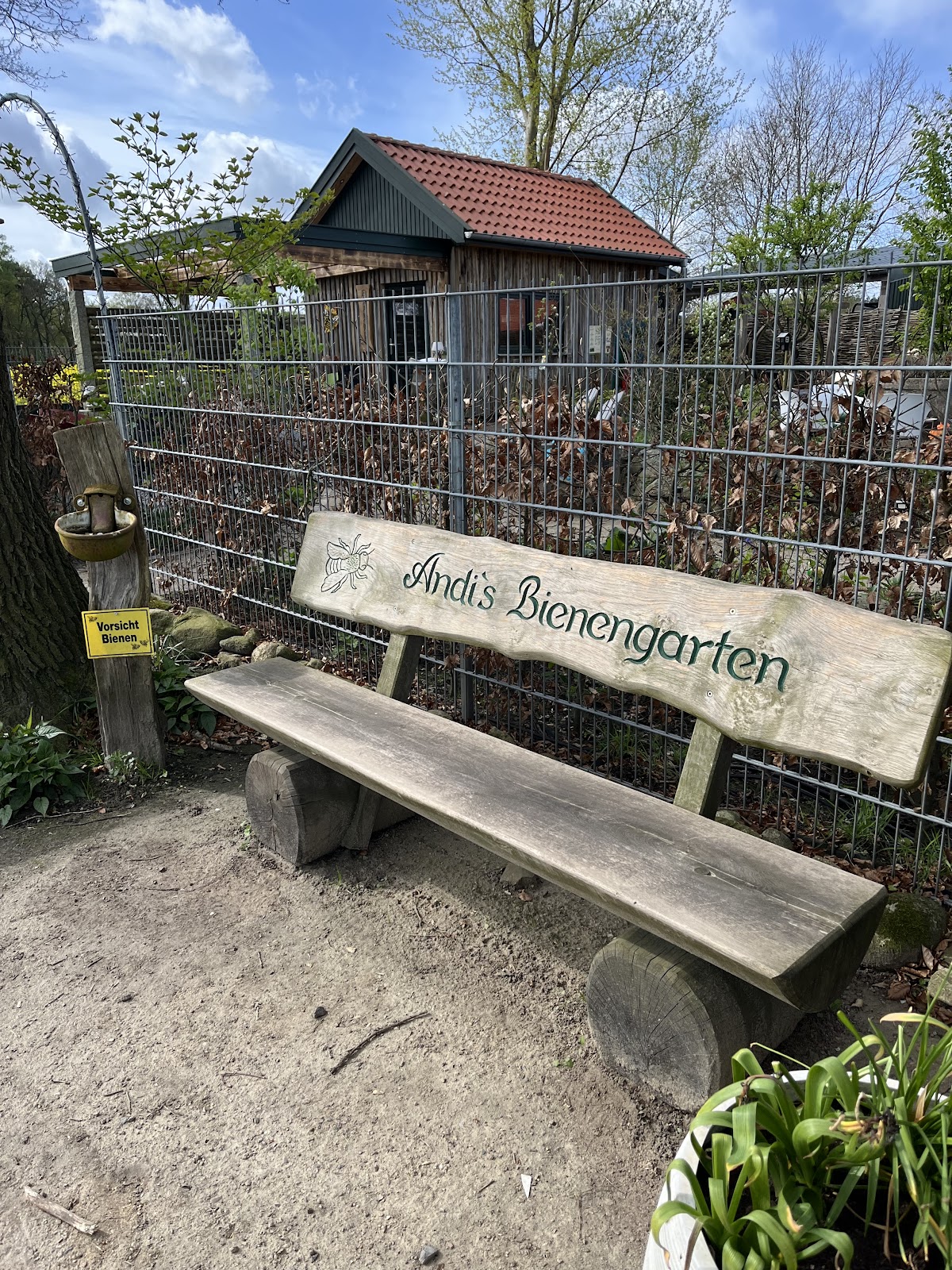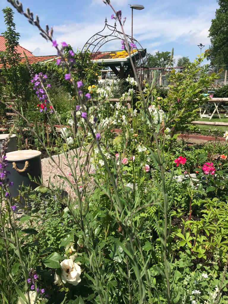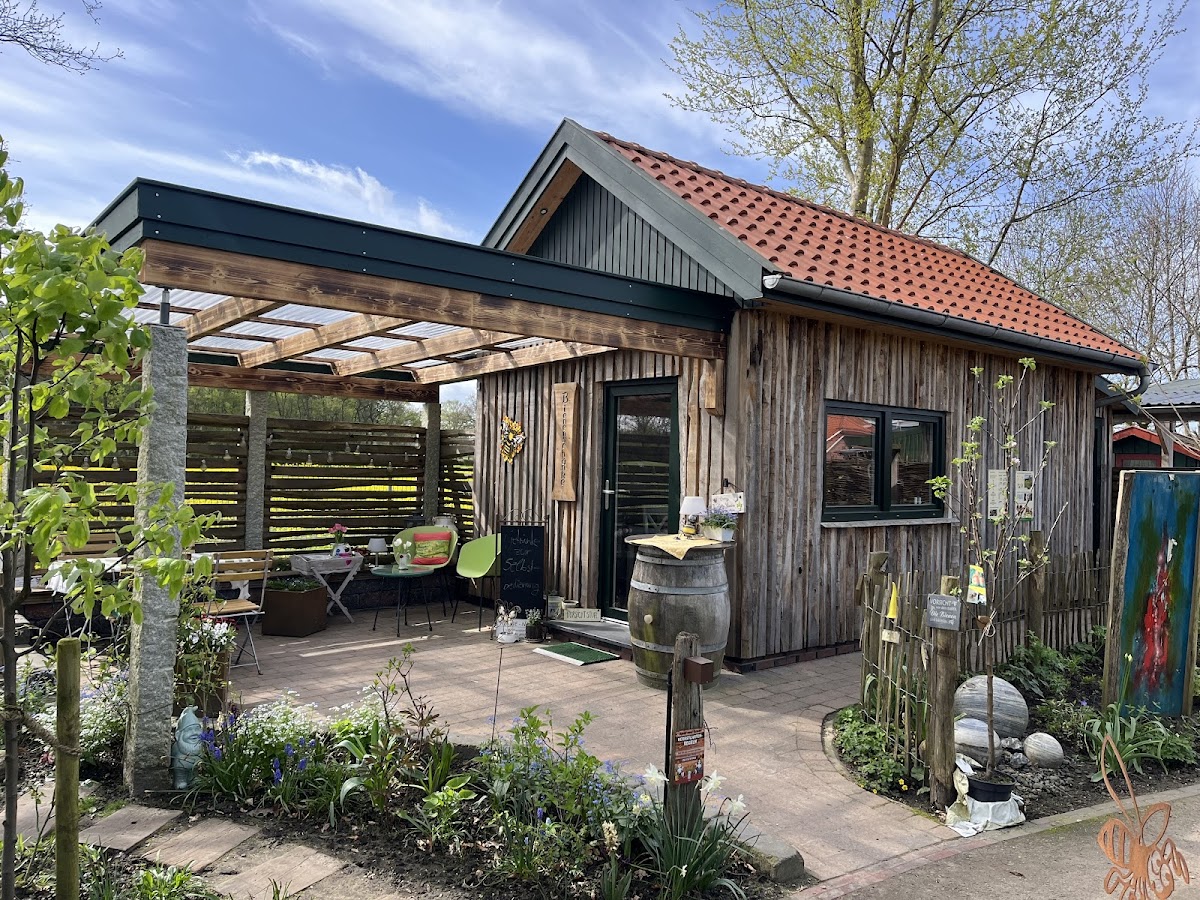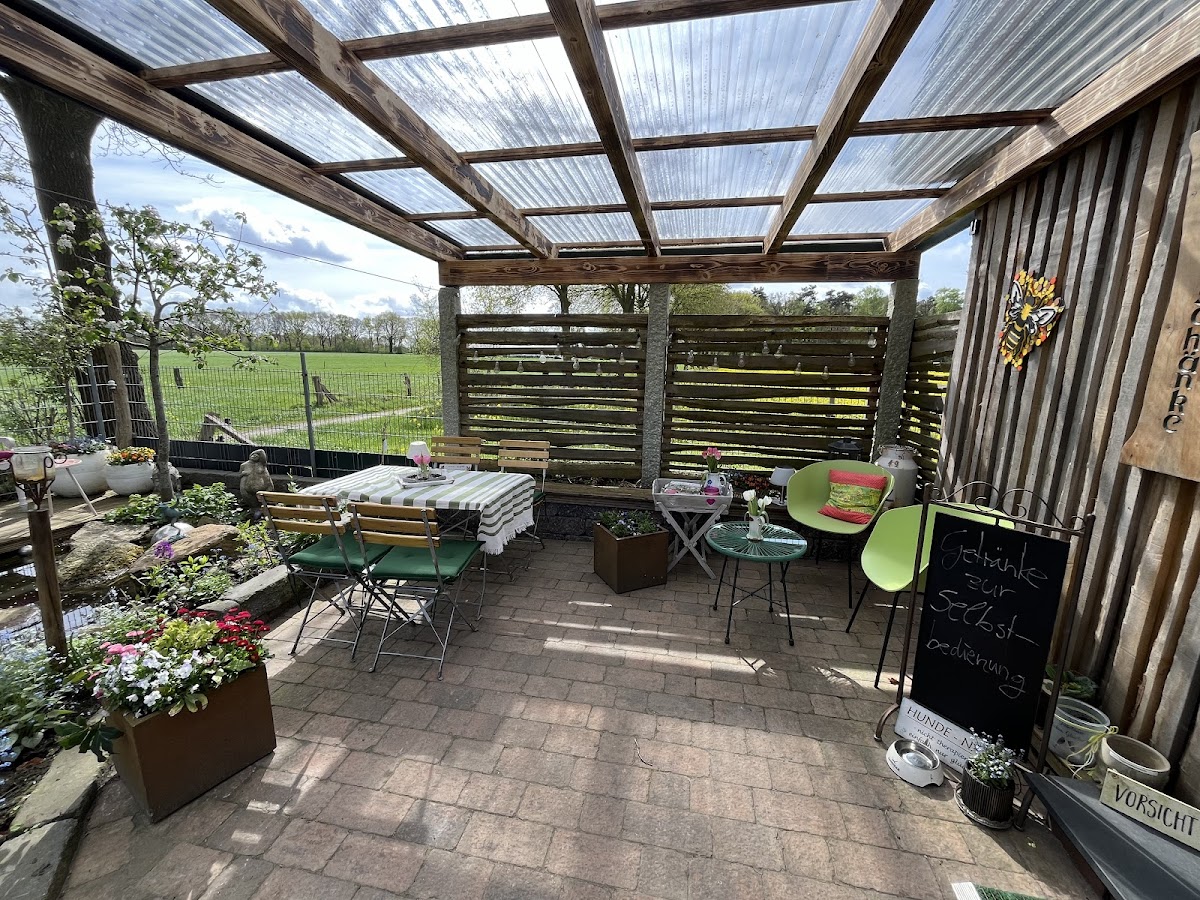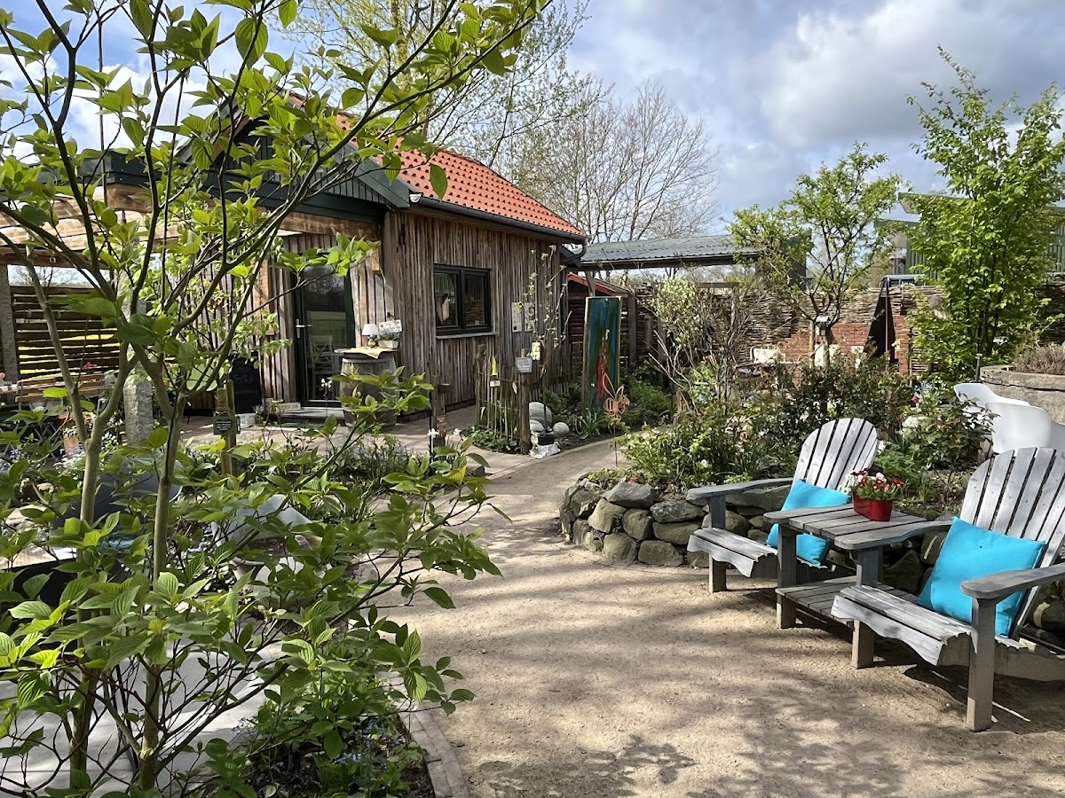 Herrlich angelegter Garten mit kleinen Nischen mit Sitzgelegenheiten, die geschmackvoll eingerichtet sind und umgeben von vielen hübschen Blumen und Pflanzen und kleinen Schildern mit netten Sprüchen. Selbstbedienung mit selbstgebackenen Kuchen und diversen Getränken , Zeitschriften und Honig zu kaufen. Alles gemütlich und das beste ist die Toilette mit Musik von.....Ha Ha das verrate ich nicht- selbst einen Besuch machen und dann könnt Ihr lachen!!!!