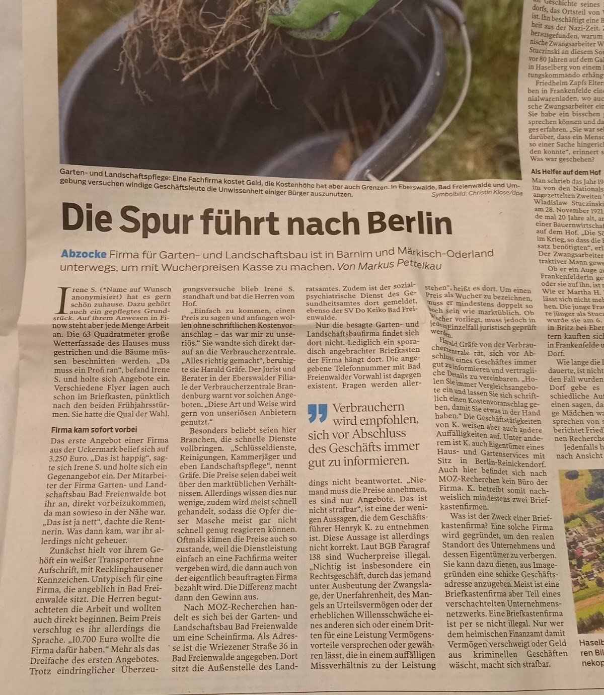 Leider keine fachmännische Arbeit, sehr laienhaft und bloß schnell schnell hingefutscht. Die Preise, die für diese Pflasterarbeiten verlangt werden, sind absolut nicht im Verhältnis zur Qualität, sondern maßlos überzogen! Selbst nach Nachbesserung ist das Ergebnis nicht zufriedenstellend Wenn möglich würde es gar keinen Stern geben Im Nachhinein stellte sich heraus dass es Betrüger sind, siehe Zeitungsartikel