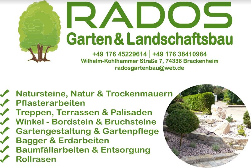 Ich haben bisher nur die besten Erfahrungen mit Rados Garten & Landschaftsbau gemacht. Die Beratung ist hervorragend und flexibel, das Team ist (z.B. auch bei garstigsten Wetterbedingungen) hochmotiviert und mit viel Hingebung und Liebe an der Arbeit, die einzelnen Mitarbeitenden freundlich und kompetent und das Resultat überzeugt in allen Punkten (inkl. Einhaltung der Offertbedingungen). Seit die Rados Garten & Landschaftsbau bei mir am Werk war, habe ich noch mehr Freude an meinem Garten. Vielen herzlichen Dank!