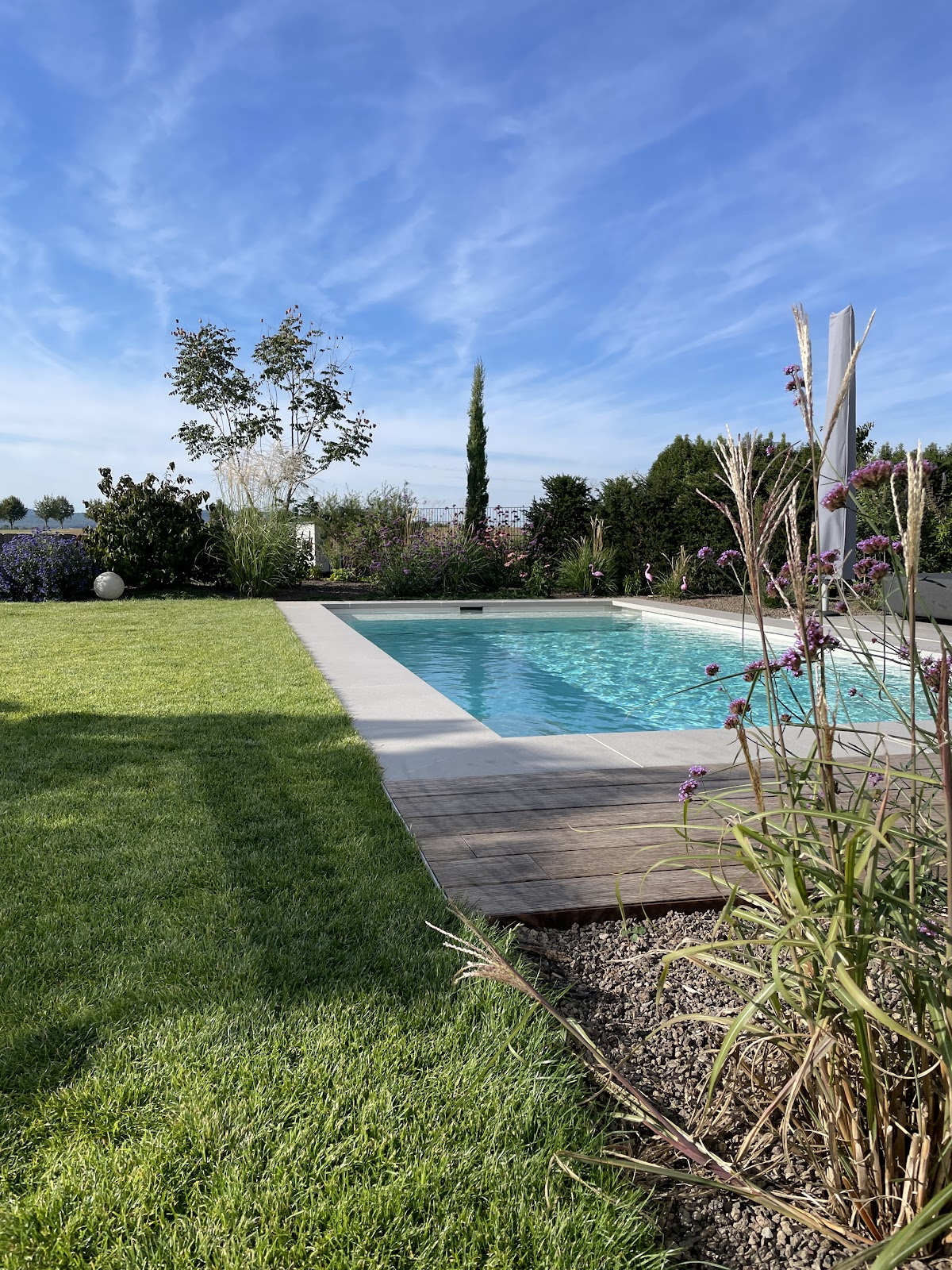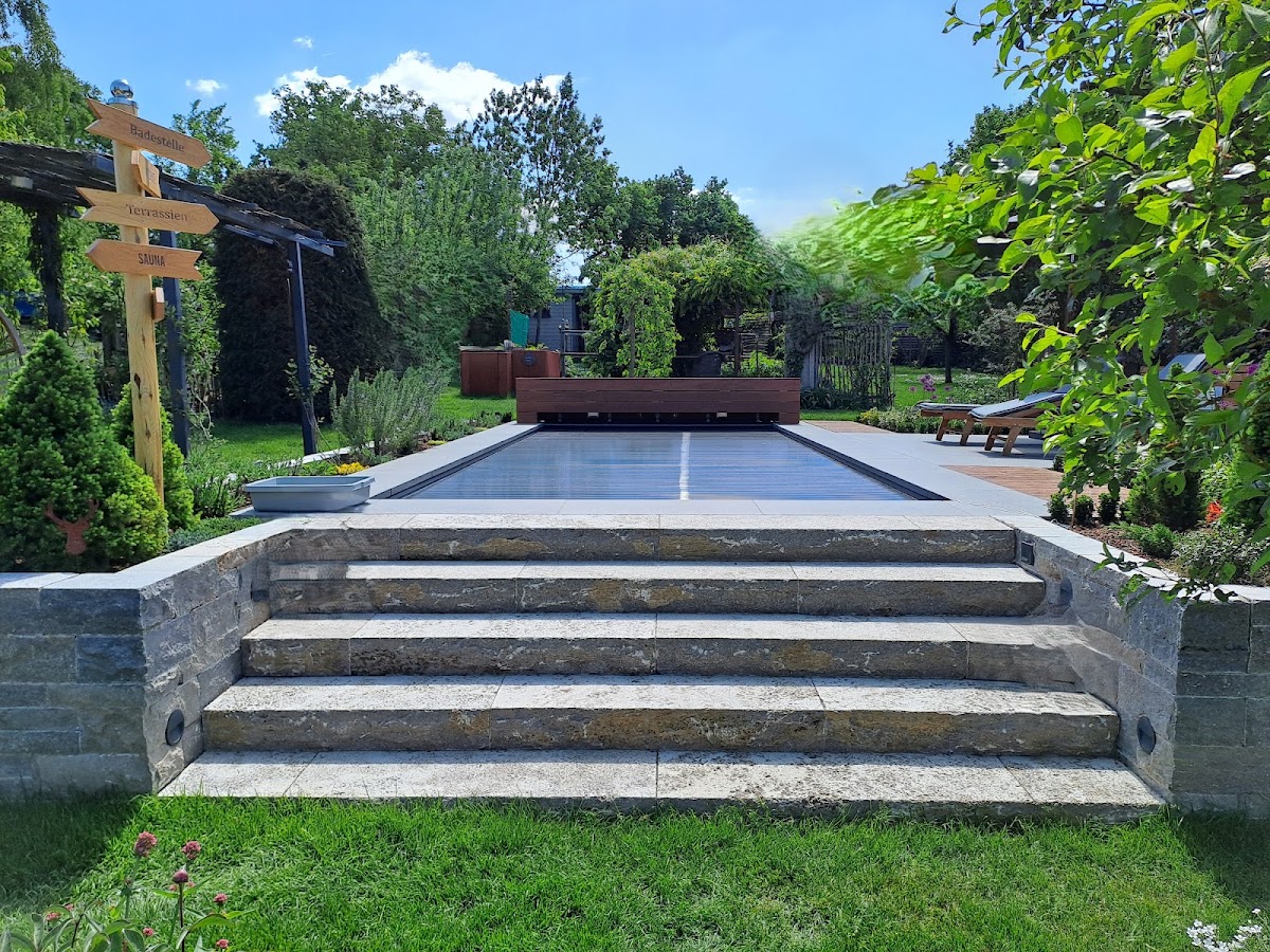 Wunderschöner Garten mit beneidenswertem Pool. Ein Aushängeschild für das Gartenbau-Unternehmen. Sehr nette Inhaber.