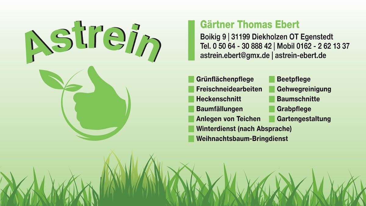 Ich habe die Firma Astrein bereits 2× für Baumschnittarbeiten beauftragt und bin sehr zufrieden. Terminbesprechung ist schnell und unproblematisch. Vor Ort wird sich ein Gesamteindruck verschafft, alles besprochen. Gute Beratung, nette Leute. Auftrag wird sehr gut ausgeführt und gut aufgeräumt.