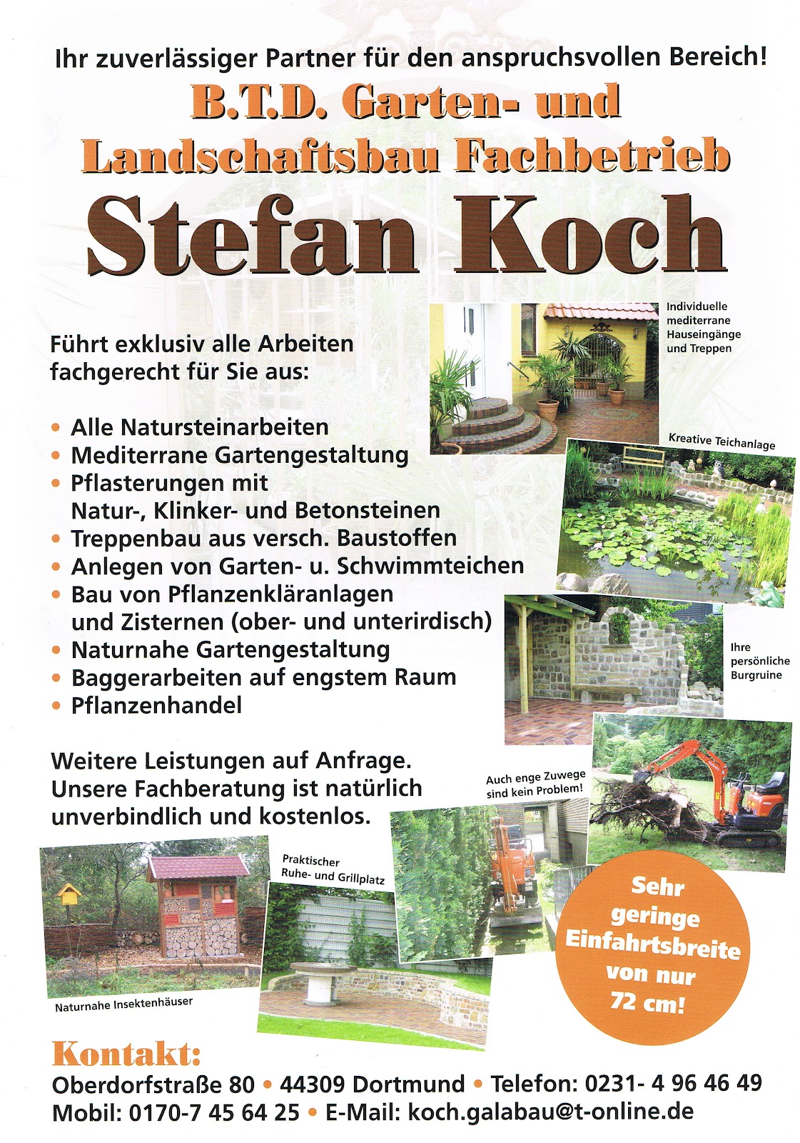 Wir haben stets gute Erfahrungen mit Herrn Kochs Betrieb gemacht, daher bemühen wir ihn immer gern aufs Neue. Es wird schnell deutlich, dass professionell beraten und gearbeitet wird. Herr Koch geht sehr durchdacht vor, so dass es im Nachhinein keine bösen Überraschungen gibt. Besonders vorteilhaft: Der Kunde weiß jederzeit, wie genau die Arbeitsprozesse ablaufen, sodass eventuelle weitere Arbeiten, die andere handwerkliche Betriebe übernehmen, reibungslos durchgeführt werden können. Auch die direkte und humorvolle Kommunikation macht die Zusammenarbeit sehr angenehm. Fazit: klare Empfehlung für B.T.D. GaLaBau Koch.