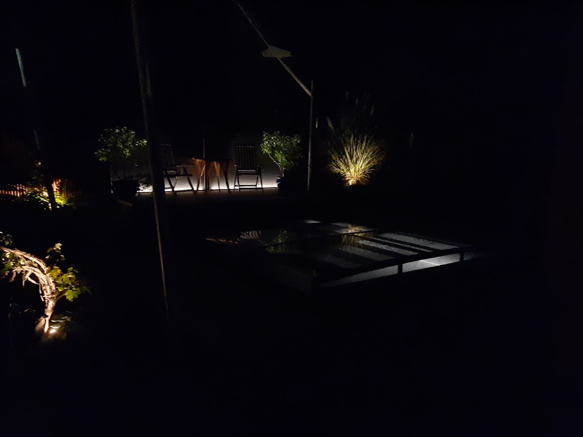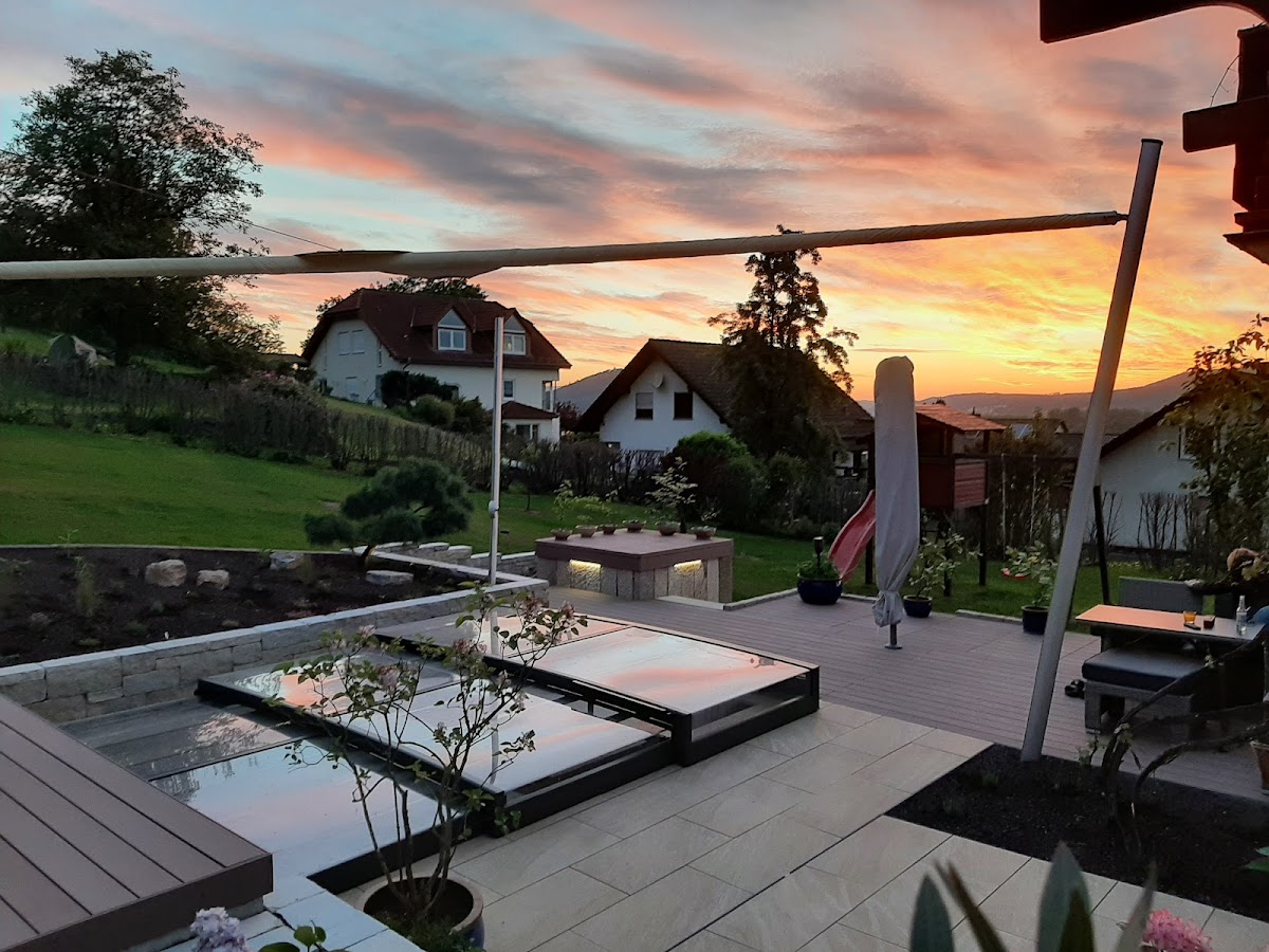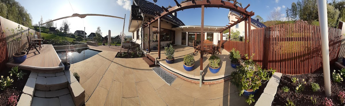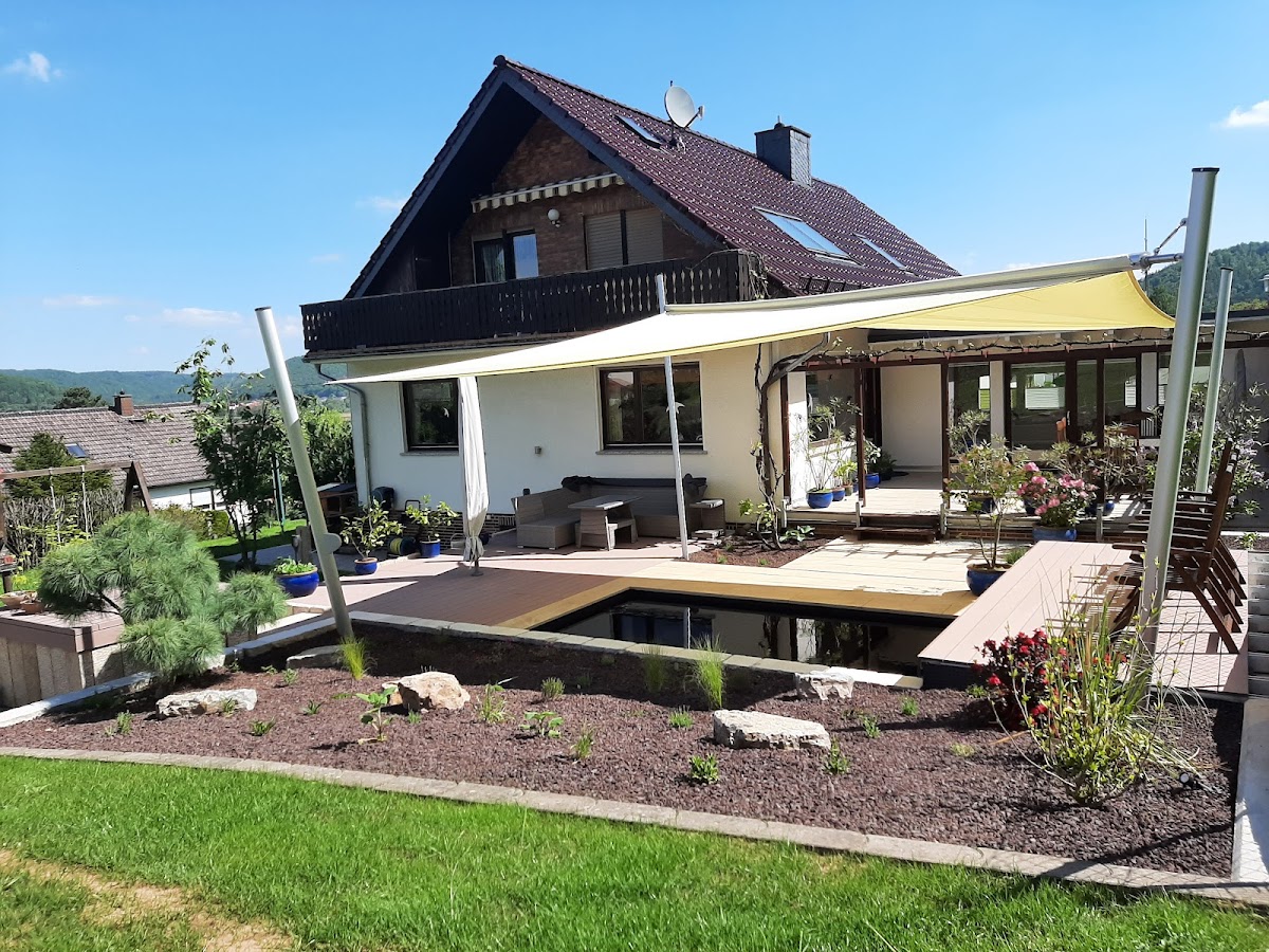 Neugestaltung Terrasse, Garten inkl.Genesis-PE-Koiteich inkl. Filter + Technik. Uns gefiel der Garten-Gestaltungsstil der Firma Fahrers Gärten schon immer ausgezeichnet, daher war für uns von Anfang an klar, wer unseren Garten umgestaltet. Das Preisangebot lag zwar deutlich über unserer Erwartung, geht man es aber genau durch, erkennt man schnell, wie viele Details bedacht werden und wie massiv so mancher Unterbau gebaut wird. Kontinuierlich wurden Entwürfe zwischen uns und der Firma Fahrer ausgetauscht.Je mehr man sich hier einbringt und sich entscheidungsfreudig zeigt, umso schneller kommt man zum endgültigen Garten-Entwurf.Unsere Vorstellungen wurden immer schnell aufgegriffen und man verstand unsere Ansprüche recht schnell. Es wurde uns nie etwas aufgeschwatzt, es ging stets darum, uns einen individuellen Garten nach unseren Vorstellungen im einzigartigen Fahrer-Stil zu entwerfen. Die Ausführung vor Ort wurde von einem gut ausgebildeten und ausgerüsteten Team aus Fachkräften übernommen, sie war stets professionell und man ging (wo möglich und sinnvoll) immer auf Detailwünsche ein. Der Datenaustausch zwischen Fahrers Gärten und GENESIS lief reibungslos, es wurden Pläne und technische Zeichnungen mit der ausgetauscht, um den Verlauf der Rohre sowie die Höhen des Teichfundaments und des Filterfundaments definieren zu können. Der fertig geschweißte 16.000 Liter PE-Teich mit 1cm Wandstärke wurde von GENESIS per Anhänger geliefert und von der Fa. Wiemann per Kran in den Garten gehoben. Die Position des Teiches wurde durch ein vorbereitetes Schnurgerüst eingepasst. Die Anlage läuft nun ideal im Schwerkraftbetrieb mit 110er Rohren, 1 Bodenablauf, 1 Skimmer, 3m Bürstenfilter und Biofilter-Turm (ca. 1m³Hel-X) und verbraucht dadurch vergleichsweise wenig Strom. Der Arbeitsraum um den Teich herum wurde mit Drainage-Beton verfüllt, damit die nötige Standfestigkeit des PE-Beckens im Falle eines abgelassenen Teiches gewährleistet ist. Die Terrasse und das Teichumfeld wurden mit WPC und Keramikplatten gestaltet, der Weg vom Hauseingang zum Garten wurde neu gepflastert und natürlich wurde bei allen Flächen an das entsprechende Gefälle und die Ableitung des Regens gedacht. WPC-Unterbau, Mauern, Pflaster, Stelen, Sonnensegel-Fundamente, Beetumrandungen etc. wurden dauerhaft betoniert, eine Zisterne wurde gesetzt, die Erde wurde nach dem matschigen Winter aufgelockert, gedüngt und wieder mit Rasen eingesät, Bäume wurden gepflanzt und die Beete wurden mit ausgewählten Pflanzen versehen. Diese Pflanzen waren im ersten Jahr sehr klein und die Beete sahen zunächst etwas leer aus, aber keine Angst diese Profis wissen genau was sie da tun, denn bereits im nächsten Jahr legten die Pflanzen ordentlich an Größe zu und es hätten kaum mehr Pflanzen sein dürfen. Das vollautomatische Sonnensegel von Soliday wurde perfekt ausgemessen und eingerichtet,es funktioniert einwandfrei. Insgesamt wurde hier eine anspruchsvolle Baustelle mit schwieriger Zuwegung im Einklang mit anderen Firmen absolut professionell abgewickelt und das Angebot passte am Ende bequem zur Schlussrechnung. Resümee: Lieber einmal richtig bauen lassen als am falschen Ende sparen. Ein schöner Garten vom Profi kostet natürlich Geld, aber wer einmal schlechte Handwerker auf dem Grundstück hatte, der gibt dieses Geld gerne aus. Herzlichen Dank Firma Fahrer, für dieses wunderbare Stück Lebensqualität!! 😊
