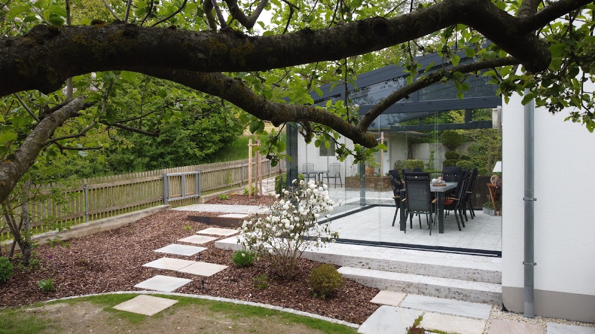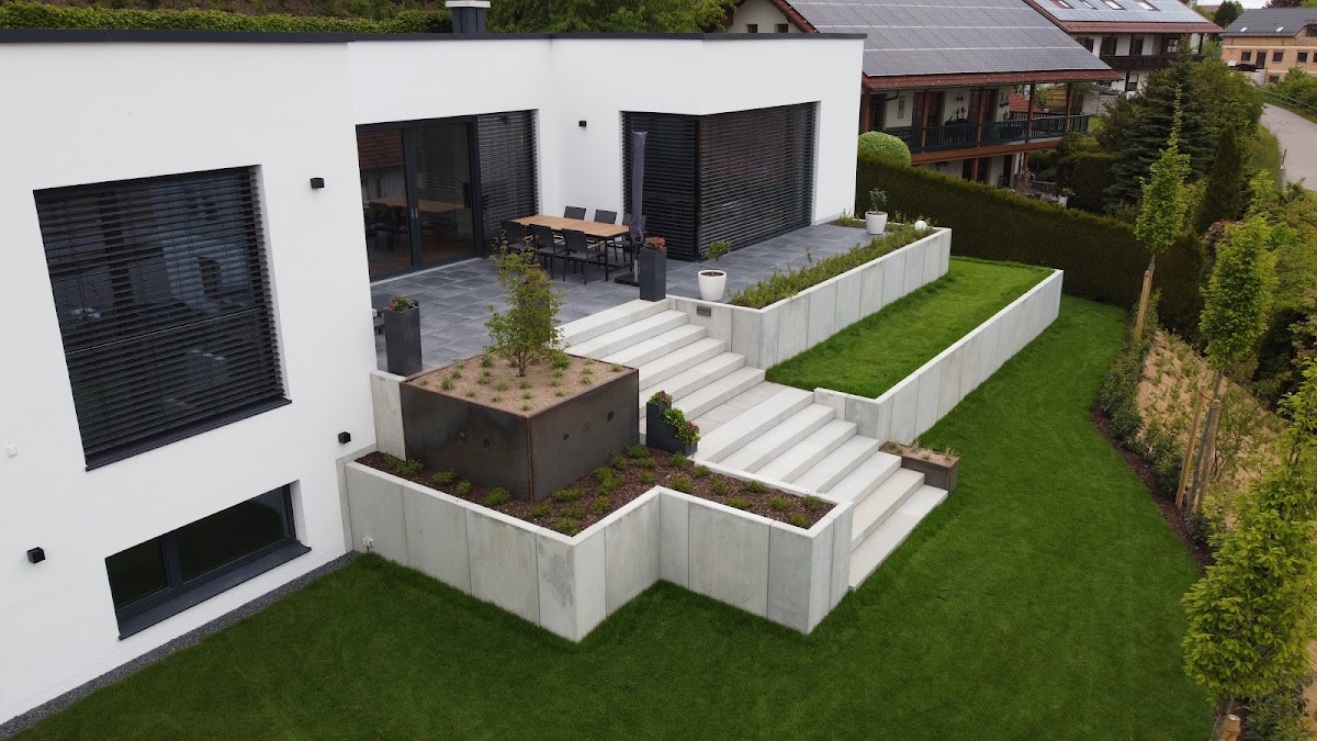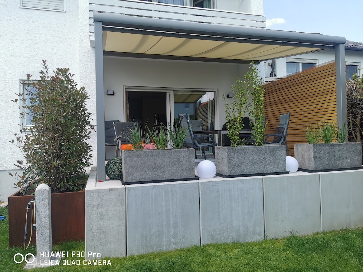 Es galt eine kleine alte Terrasse vollständig abzutragen und durch eine größere zu ersetzen. Es wurden Beton-L-steine und Feinsteinzeug-Platten auf Drainage Mörtel sowie Granitblockstufen für die Treppe verwendet. Ferner wurde eine Sickerschachtanlage für die Dachentwässerung erstellt sowie u.a. eine Metallhalterung für die in Eigenregie erstellte Sichtschutzwand einbetoniert. . Die Zusammenarbeit mit Herrn Geltl war von der Planungsphase bis zur Realisation äußerst professionell und vertrauensvoll. Das erstellte Angebot war transparent und immer nachvollziehbar, was sich auch bei der Rechnungstellung nach Bauabschluss fortsetzte. Es gab keine unerwarteten Kosten. Die termingerechte Bauausführung ist hervorzuheben. Ein besonderer Dank gilt dem Bauteam mit Gartenbaumeister Tobi. Perfektion bis zur Vollendung. Wenn Probleme auftauchen hat er allermeistens eine pragmatische Alternativlösung. Eine tolle tolle Arbeitsleistung!! Jetzt hoffen wir, dass trotz Witterungseinflüssen uns lange Zeit Freude an der Terrasse geschenkt wird.