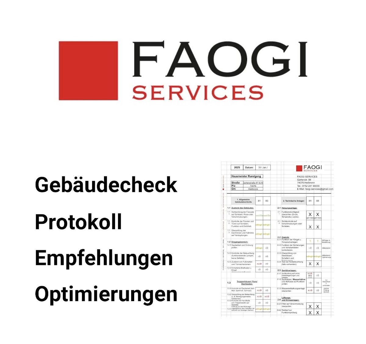 Gerade wenn die Witterung mal wieder regnerisch ist und Unkraut sowie Moos sprießen, zeigt sich die Qualität von FAOGI SERVICES. Auf unseren Pflastersteinen bildet sich gegen Winter vermehrt Moos, wodurch eine Rutschgefahr entsteht. Das Team hat diese Situation schnell und gründlich behoben und dabei alle abgesprochenen Arbeiten sorgfältig ausgeführt. Besonders positiv ist uns aufgefallen, wie zuverlässig und vorausschauend gearbeitet wird, ohne dass wir jedes Detail ansprechen mussten. Wir sind mit der Dienstleistung sehr zufrieden und möchten sie auch künftig gerne in Anspruch nehmen. FAOGI SERVICES ist absolut empfehlenswert – sei es für Hausmeistertätigkeiten, Gartenpflege oder Arbeiten an Außenanlagen.