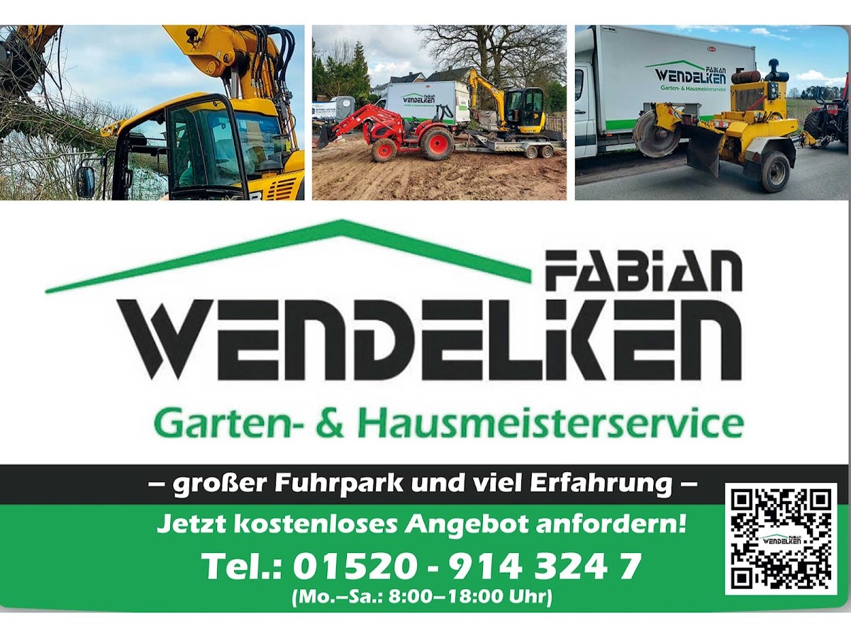 Fabian Wendelken hat bei mir die Hecke herausgearbeitet, geschnitten und die Baumstümpfe gefräst. Trotz seines jungen Alters beeindruckte er mit professionellem Equipment und einem beeindruckenden Fuhrpark. Ich bin äußerst zufrieden mit seiner Arbeitsleistung und froh, mich für ihn entschieden zu haben. Vielen Dank! Ich würde auch 6 Sterne geben