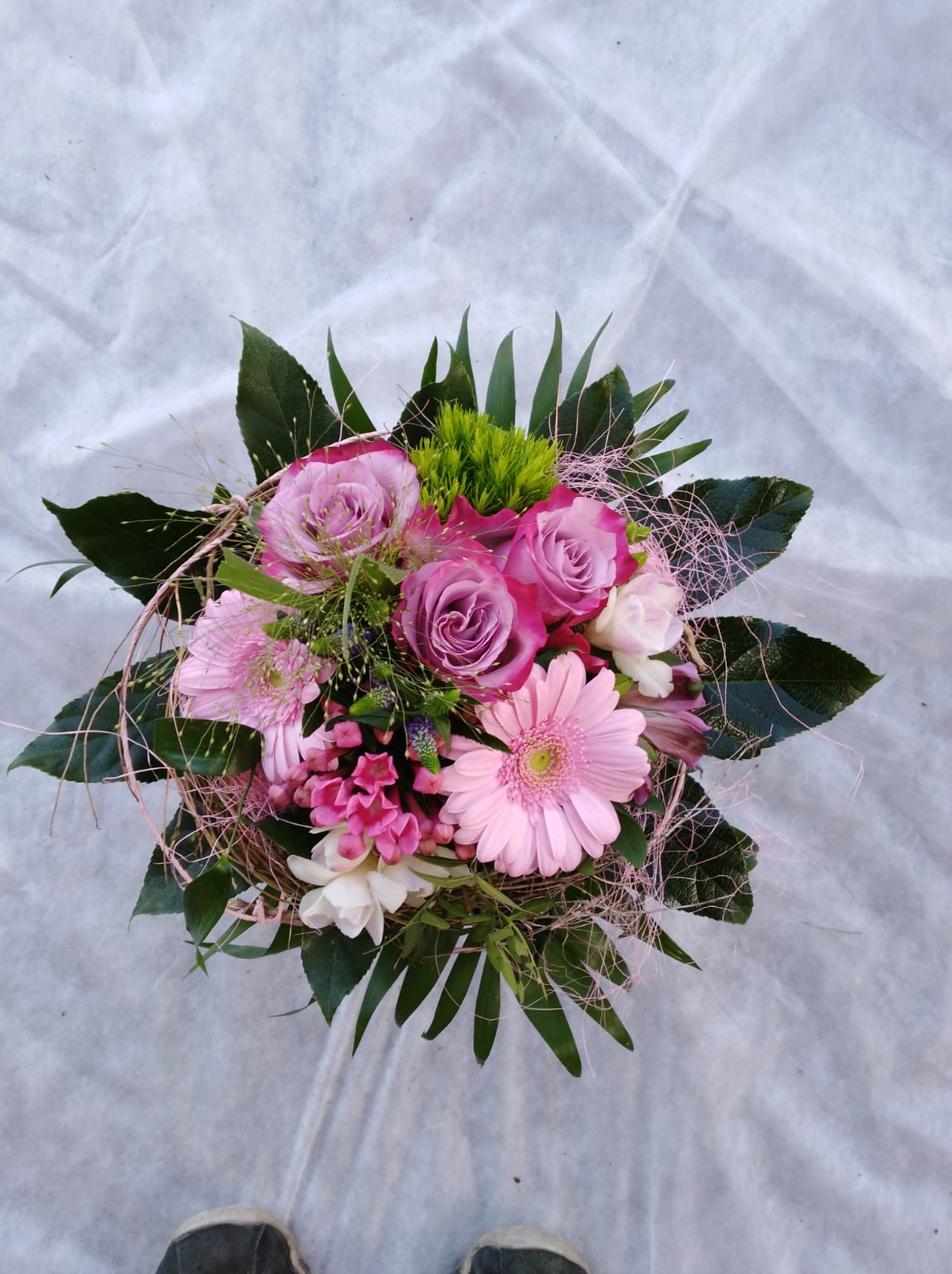Leider wurde der Blumenstrauß nicht passend zusammengebunden. Die Blumen „lagen“ einfach so zusammen wie man sie halt rausgezogen hat. Dass dann 4 gelbe Blumen auf einem Fleck sind und 4 rote Rosen nur auf einem Fleck ohne dies farblich schön zu verteilen ist leider nicht grad schön.