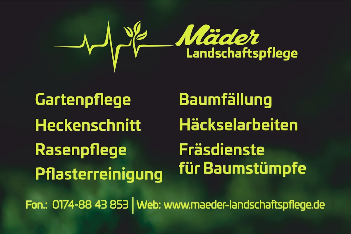 Ich habe Mitte Juli'24 Kontakt mit Mäder Landschaftspflege aufgenommen . Der junge Unternehmer kam nach kurzer Terminvereinbarung zur Besichtigung. Ich bekam kurze Zeit später einen Terminvorschlag und ein Kostenangebot. Gestern und heute hat Herr Mäder meinen Garten auf vordermann gebracht , d.h. den Rasen und die Hecken geschnitten. Ich bin mit der geleisteten Ausführung dieser Arbeiten mehr als zufrieden. Vielen Dank! Ich würde ihn jederzeit den Auftrag wieder erteilen und kann ihn guten Gewissens weiterempfehlen.