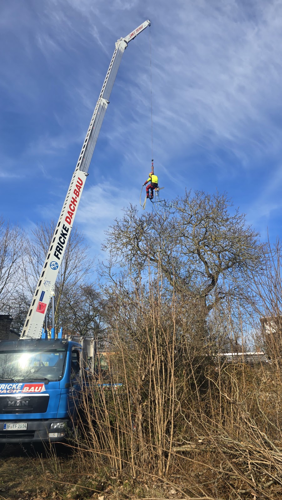 Effizienter und zeitsparender lässt sich die Baumfällung auf dem beengten Grundstück nicht durchführen. Mangels Platz für eine Arbeitsbühne erfolgte der Einsatz eines Krans.