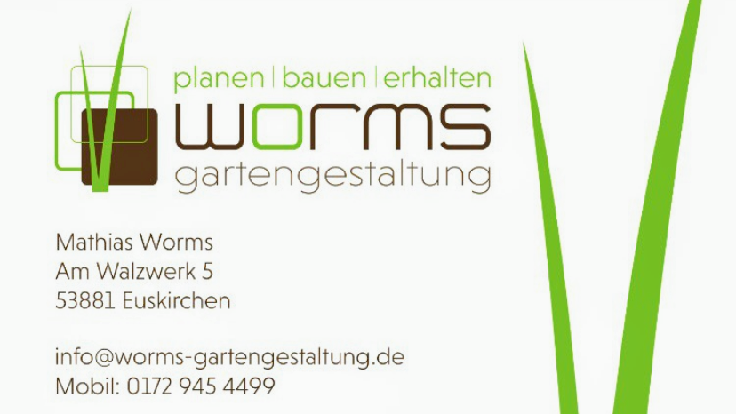 Wir sind absolut begeistert von der Arbeit, die Worms Gartengestaltung geleistet hat! Die Ausführungsplanung war hervorragend und die Beratung war einfach top. Von Anfang an fühlten wir uns gut aufgehoben und die Ideen, die uns präsentiert wurden, waren kreativ und auf unsere Wünsche abgestimmt. Die Umsetzung verlief reibungslos und das Team war stets professionell und freundlich. Vielen Dank für die tolle Arbeit! Wir können die Firma Worms Gartengestaltung nur wärmstens empfehlen!